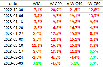 Na naszych radarach pojawił się ciekawy sygnał statystyczny. 52-tygodniowe zmiany indeksów warszawskiej giełdy zaczęły wychodzić na plus. Najpierw, już w połowie lutego, sztuka ta udała się indeksowi małych spółek sWIG80, zaś w ostatnim tygodniu sygnałami takimi mogły się pochwalić WIG oraz mWIG40 (pod kreską jest już tylko WIG20).