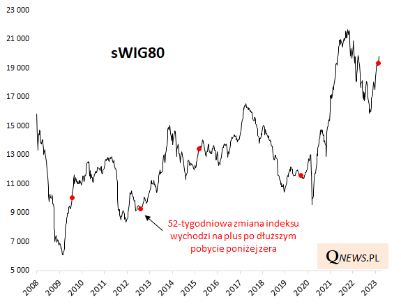Można się zastanawiać jakie jest znaczenie tych faktów dla dalszych losów indeksów. Sprawdziliśmy co działo się historycznie po wyjściu na plus 52-tygodniowej zmiany.