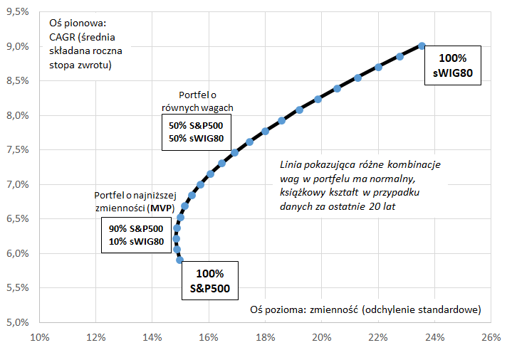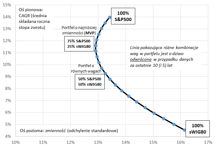 Zauważmy, że chociaż linie na wykresach mają odwrócony względem siebie kształt, to jednak mimo wszystko mają pewną cechę wspólną. Nie są liniami prostymi, lecz zakrzywionymi na tym odcinku, który jest położony blisko 100-procentowej wagi amerykańskich akcji. To „wybrzuszenie” w lewo oznacza, że dodając pewną porcję polskich walorów (w tym przypadku z sWIG80) do koszyka pozwalałoby zmniejszać zmienność całego portfela w porównaniu z czysto amerykańską alokacją. Stwierdzenie to dotyczy nawet pierwszego wykresu (ostatnie 10 lat), na którym jak wspomnieliśmy polskie akcje przegrywają przecież pod względem stóp zwrotu.
