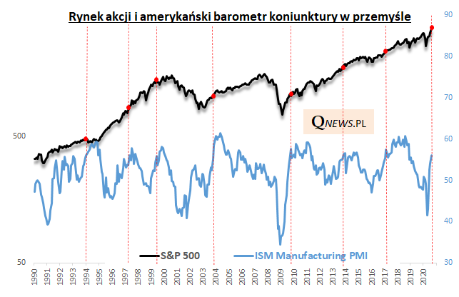 Podczas gdy w kwietniu indeks ISM runął do 11-letniego minimum (41,5 pkt.), to od tego czasu systematycznie się wspina. W sierpniu zawędrował do 56 pkt., co jest poziomem najwyższym od ponad półtora roku. Równolegle do zwyżki ISM odbywa się marsz w górę cen akcji na Wall Street.