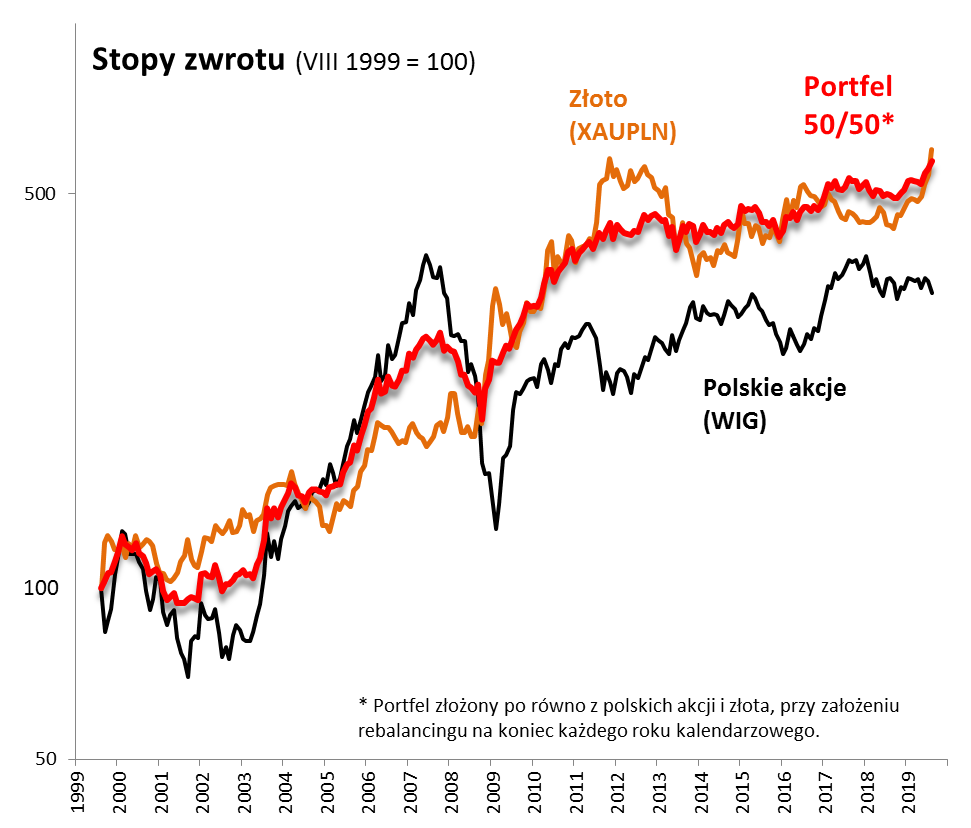 W ostatnich 20. latach portfel złożony z polskich akcji oraz złota radziłby sobie lepiej zarówno niż akcje, jak i złoto. Oba aktywa uzupełniały się, podążając do celu różnymi ścieżkami. Efekt – radykalna redukcja zmienności, przy jednoczesnej niezauważalnej redukcji stopy zwrotu.