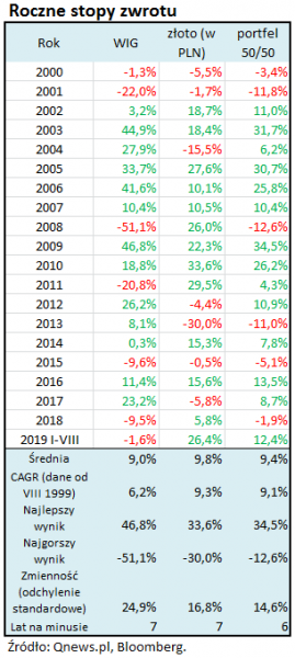 Na wykresie oraz w tabeli pokazujemy najbanalniejszy przykład takiego portfela, w którym inwestycję dzielimy po połowie między polskie akcje i złoto (50/50), na koniec każdego roku przeprowadzając rebalancing (czyli przywracamy pierwotne wagi, sprzedając częściowo to co podrożało i dokupując tego, co potaniało). Oczywiście nie należy tego rozumieć jako optymalnej kombinacji, bo naszym zdaniem portfel powinien być zbudowany także z innych aktywów, takich jak akcje zagraniczne czy obligacje. Chodzi tu raczej o podkreślenie interakcji między omawianymi aktywami.