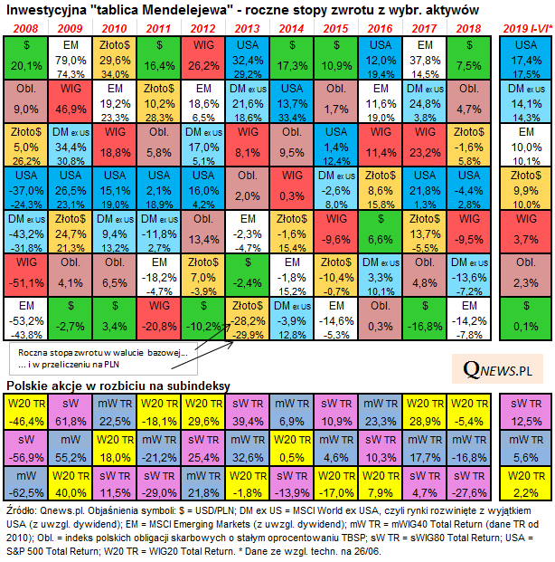 Ogólnie rzecz biorąc pierwsze półrocze było dobre dla inwestorów posiadających zdywersyfikowane portfele. Dobre stopy zwrotu wypracowały zarówno aktywa typowo ryzykowne, ale też obligacje. Blado wypadł natomiast dolar, który można postrzegać jako „bezpieczną przystań” w okresach zawieruchy na rynkach. Dywersyfikacja popłaca, podobnie jak przeważanie przegranych z poprzedniego roku – te dwie tezy przewijające się do znudzenia w naszych podsumowaniach sprawdzają się jak widać po raz kolejny.