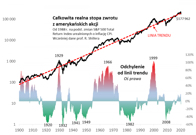 Na wykresie pokazujemy też jednak dodatkową kwestię – odchylenia od linii trendu. Inwestycja w amerykańskie akcje potrafiła odchylać się albo wyraźnie in plus od trendu, albo in minus. Największe dodatnie odchylenia przekraczające 90-100 proc. miały miejsce trzykrotnie na przestrzeni badanego okresu – w latach 1929, 1966 oraz 1999. Kupowanie akcji w tych krytycznych punktach przynosiło inwestorom wielkie rozczarowanie bezpośrednio w następujących po nich podokresach.