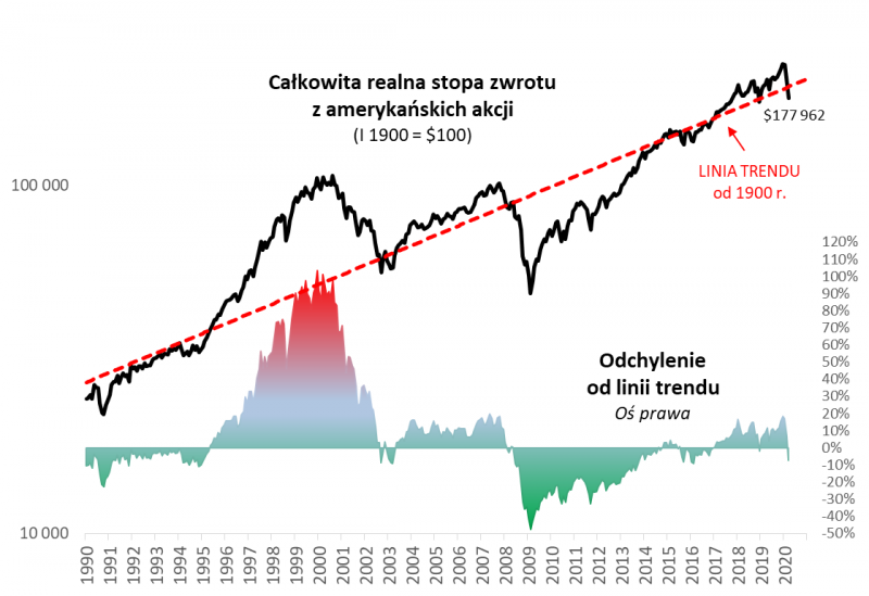 Jak pod tym względem wygląda obecna sytuacja? Dobra wiadomość jest taka, że nie mamy do czynienia z dodatnim odchyleniem od linii trendu. Pewne odchylenie widoczne przed krachem zostało już w zupełności zniwelowane. A gorsza wiadomość? Na tym etapie nie sposób też mówić o silnym ujemnym odchyleniu. To nie jest sytuacja porównywalna z jesienią 2008, gdy Warren Buffett głośno przekonywał o świetnych długoterminowych perspektywach akcji.