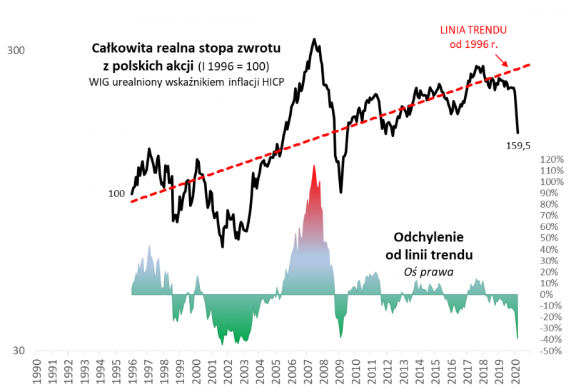 Jakkolwiek znów musimy zastrzec, że ten stan rzeczy nie musi o niczym przesądzać na krótką metę, to w horyzoncie wieloletnim REALNA stopa zwrotu z WIG-u powinna składać się z dwóch składników, którymi są (a) stopa zwrotu implikowana przez linię trendu na poziomie 4,4 proc. w skali roku, (b) potencjał wynikający z drastycznego odchylenia w dół od linii trendu.