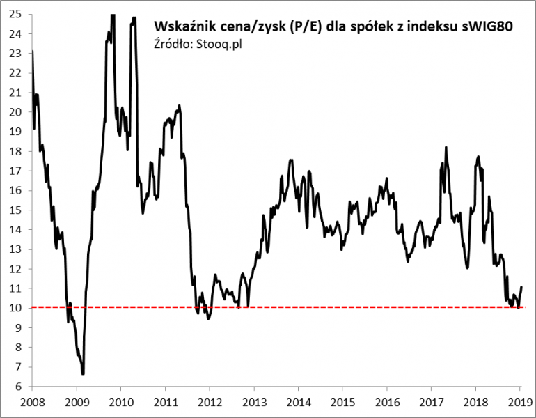 Także wyceny walorów zeszły do poziomów niewidzianych od lat. Pod koniec ubiegłego roku wskaźnik cena/zysk (P/E) dla indeksu kojarzonego z małymi spółkami znalazł się poniżej granicy 10. Kiedy poprzednio był w tej okolicy (lata 2011-2012), dla długoterminowych inwestorów była to dobra okazja do zakupów. Wyraźnie tańsze akcje „maluchów” były jedynie w kulminacyjnej fazie globalnego kryzysu finansowego (2008/2009) – ale to były ekstremalne okoliczności.