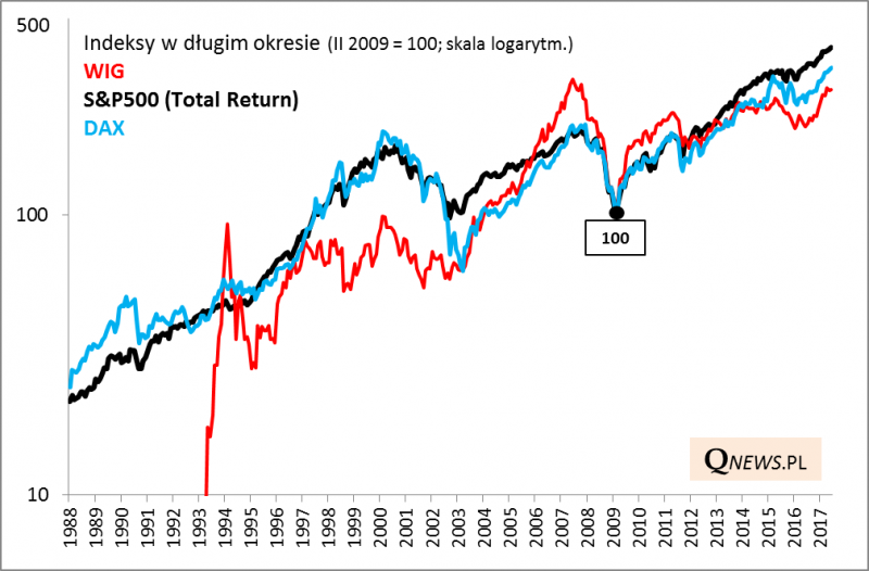 - O ile w ostatnich pięciu latach WIG jest w tyle za Amerykanami (i Niemcami), to w perspektywie wielu lat zdarzało się na odwrót - to nasz rynek okazywał się silniejszy (przykład: 2006-2007).