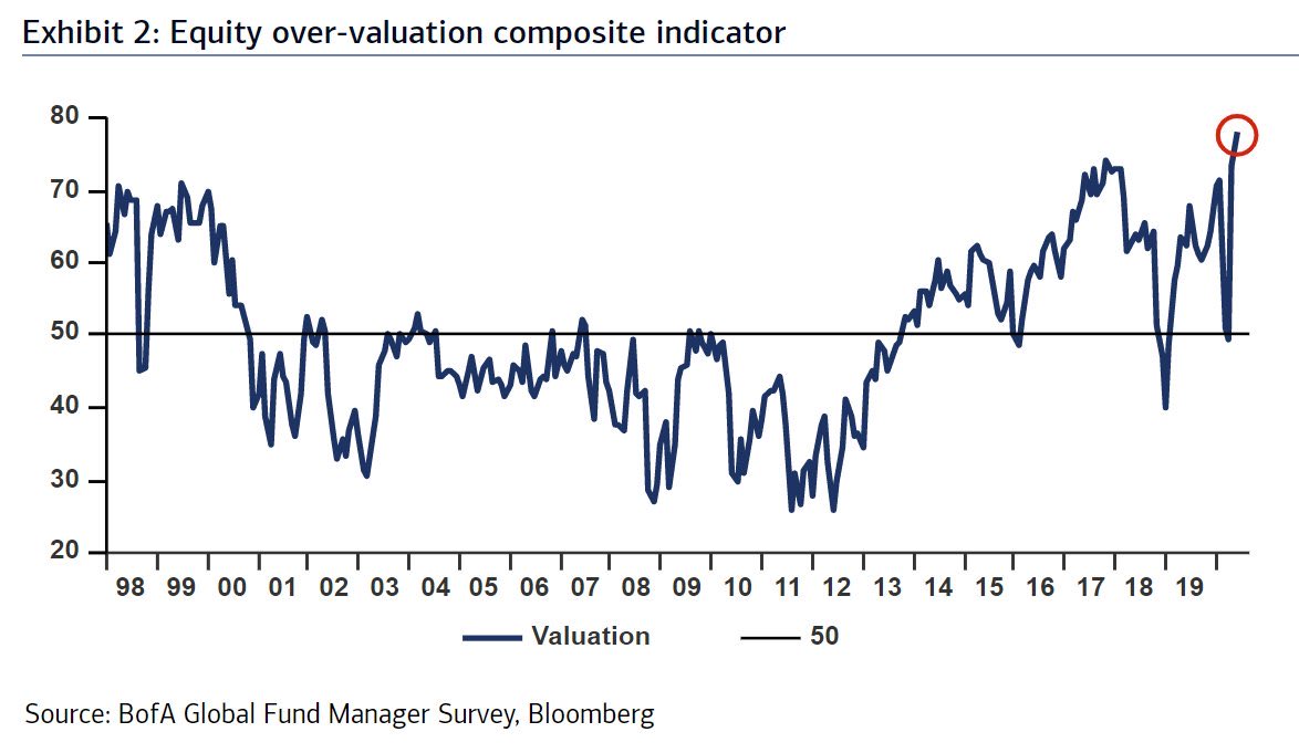 Ale co ciekawe nie wszystkie elementy sondażu BofA należy interpretować kontrariańsko (czyli działać wbrew opinii większości). Tym razem bank przytacza ciekawy wskaźnik pokazujący, że kiedy większość zarządzających uważała, że akcje na świecie były drogie, to ... faktycznie takie były (a potem taniały), zaś kiedy większość uważała, że były tanie, to faktycznie takie były (np. na przełomie lat 2008/09 lub w latach 2011, 2012). Sęk w tym, że obecnie odsetek netto menedżerów uznających akcje za drogie (przewartościowane) podskoczył do ... rekordowego poziomu.