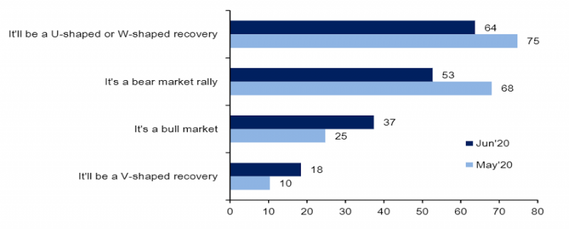 - odsetek ankietowanych uznających odbicie na giełdach jedynie za korektę w trakcie bessy (bear market rally) zmalał do 53% z 68% (ale to ciągle wysoki odsetek);