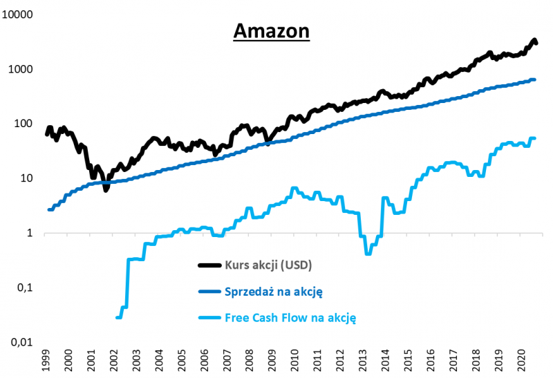 Przegląd historycznych korelacji między cenami akcji i przychodami lub FCF dowodzi, że nie są one związane sztywną liniową zależnością. Weźmy przykład Amazonu zaprezentowany na jednym z naszych wykresów. Widać doskonale, że choć w długim okresie wzrost np. przychodów stanowi fundament dla wzrostu kursu, to jednak średnioterminowo cena walorów potrafiła przejściowo rosnąć szybciej niż sprzedaż, a potem nawet przez wiele miesięcy powracać w dół do punktu równowagi.