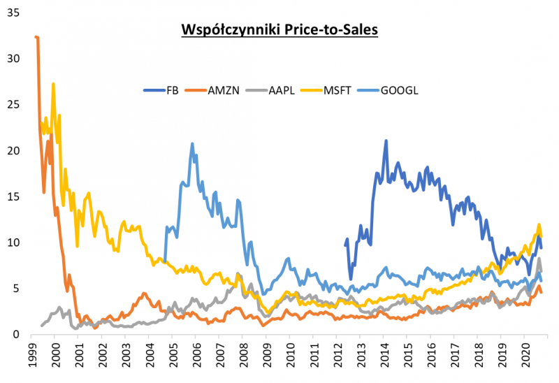 Podobne zjawisko dotyczyło właściwie każdego FAAMG z osobna, choć czasem w zupełnie innych przedziałach czasowych. Na trzecim wykresie pokazujemy, że współczynniki ceny do sprzedaży potrafiły ulegać nawet drastycznym wahaniom. Ostatnie kilkanaście miesięcy przyniosło solidarny wzrost tych wskaźników w omawianej grupie spółek, ale na szczęście nie są to poziomy porównywalne np. z bańką internetową z lat 90. czy też późniejszymi „wyskokami” P/S w przypadku poszczególnych firm (FB w 2013 r., Google w 2005).
