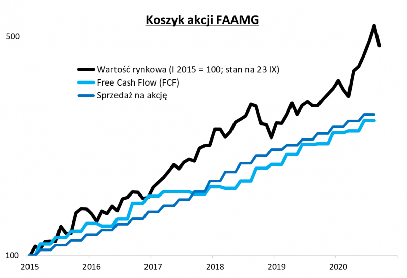 FAAMG to nie przysłowiowa „bańka”, bo mogą pochwalić się systematycznym wzrostem przychodów i przepływów pieniężnych. Z drugiej strony trudno jednak zaprzeczyć, że zwyżka cen ich akcji była od czasu marcowego krachu zbyt gwałtowna w porównaniu z poprawą tzw. fundamentów.