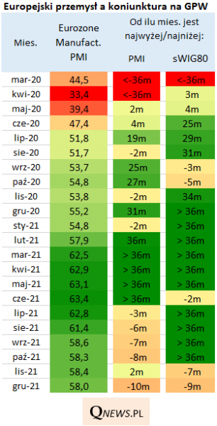 Z czego wynika ta zadyszka? Z naszych obserwacji winna jest analogiczna zadyszka w europejskiej gospodarce, na której kondycję indeksy GPW są tradycyjnie wrażliwe. Jako nieprzypadkowy traktujemy fakt, że wielomiesięcznym minimom sWIG80 (gdyby indeks zamknął grudzień na obecnym poziomie, to wg danych miesięcznych pokazanych w poniższej tabeli byłby najniżej od 9 miesięcy) towarzyszy 10-miesięczne minimum bacznie obserwowanego przez nas wskaźnika PMI obrazującego koniunkturę w przemyśle strefy euro.