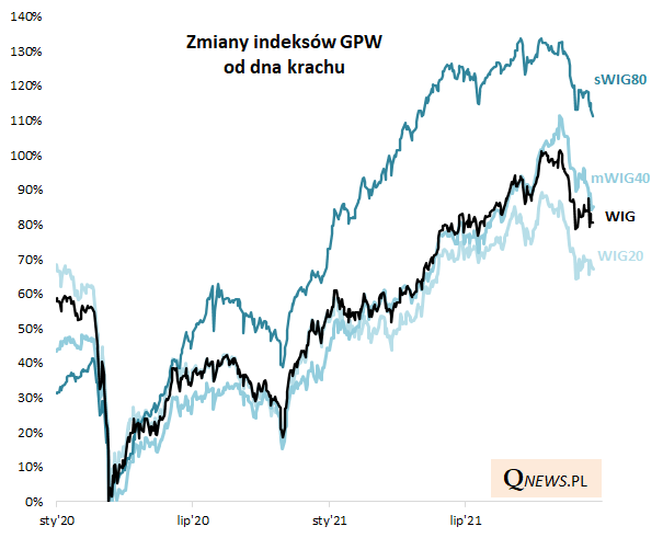 Indeksy GPW przeżywają ostatnio większą zadyszkę. Jedna z najgłębszych korekt spadkowych od czasu pandemicznego krachu w marcu 2020 sprowadziła je w okolice wielomiesięcznych minimów. Przykładowo gromadzący małe spółki sWIG80 na poniedziałkowej sesji znalazł się poniżej listopadowego dołka, lądując na poziomie najniższym od ... ponad siedmiu miesięcy (pocieszać się można tym, że i tak wypracowane przez niego stopy zwrotu są ciągle wyraźnie wyższe niż w przypadku pozostałych indeksów).