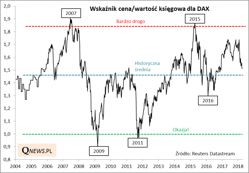 Podobny obraz sytuacji widać na wykresie P/B. Wskaźnik jest już wyraźnie poniżej styczniowego szczytu, ale też ciągle powyżej historycznej średniej.