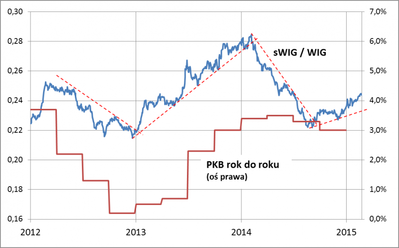 Na łamach Qnews.pl już kilkakrotnie prezentowaliśmy wykres, z którego wynika, że akcje małych spółek po słabym 2014 roku znów zachowują się mocniej niż cały rynek mierzony indeksem WIG. Teraz warto dodać do tego kolejne przemyślenia. Jak pokazuje poniższy wykres, kondycja małych firm jest szczególnie wrażliwa na to, co dzieje się w polskiej gospodarce. Ubiegłoroczna słabość "maluchów" zbiegła się w czasie z powolnym obniżaniem się dynamiki polskiego PKB.