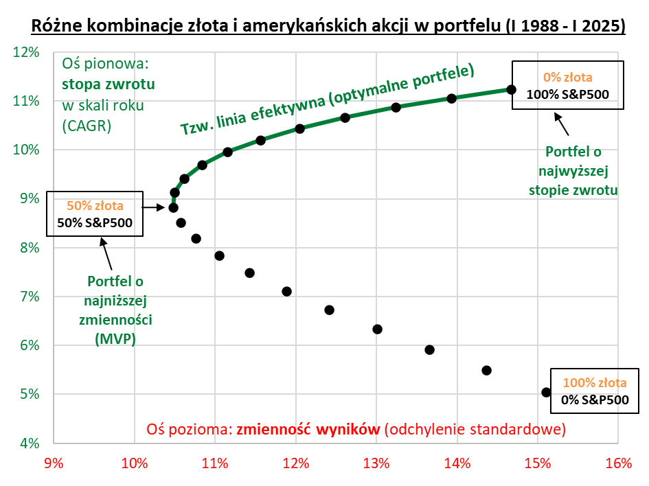 Portfel o najniższej zmienności (ang. MVP), złożony w połowie z amerykańskich akcji i złota, przyniósłby średnią roczną stopę zwrotu na poziomie 8,8 proc. Byłby to wynik o 2,4 pkt. proc. niższy niż w przypadku samych akcji, ale zmienność (odchylenie standardowe) byłaby niższa z kolei aż o 4,2 pkt. proc. – ubytek stopy zwrotu byłby więc nieproporcjonalnie mniejszy niż ograniczenie ryzyka. Ale uwaga – przekroczenie granicy 50-proc. wagi złota w koszyku zaczęłoby dawać skutki odwrotne do zamierzonych (wyższa zmienność, mniejsza stopa zwrotu). Oczywiście nie oznacza to, że jedynym optymalnym rozwiązaniem jest portfel złożony w połowie z akcji i złota. W zależności od akceptowanego poziomu zmienności (to sprawa indywidualna) inwestor może wybrać jakąkolwiek kombinację położoną na tzw. linii efektywnej (0-50 proc. złota w portfelu).