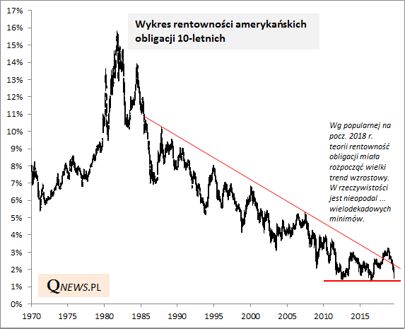 Charakterystyczne jest, że jeszcze nie tak dawno, zaledwie kilkanaście miesięcy temu, te kategorie aktywów były w tzw. konsensusowej opinii uznawane za kiepsko rokujące. Czy ktoś pamięta jeszcze, że na początku 2018 roku w atmosferze "globalnego zsynchronizowanego ożywienia" znani guru rynkowi na wykresie rentowności amerykańskich obligacji 10-letnich rysowali linię długoterminowego trendu spadkowego, której przebicie miało rzekomo zwiastować wielką bessą w tej klasie aktywów (wzrost rentowności, spadek cen)? Co z tego wyszło? No cóż, tak jak to często bywa z konsensusowymi opiniami, potrafią realizować się przekornie scenariusze ... odwrotne. Obecnie rentowność obligacji zamiast realizować modny wtedy scenariusz, zbliża się do wieloletnich dołków.
