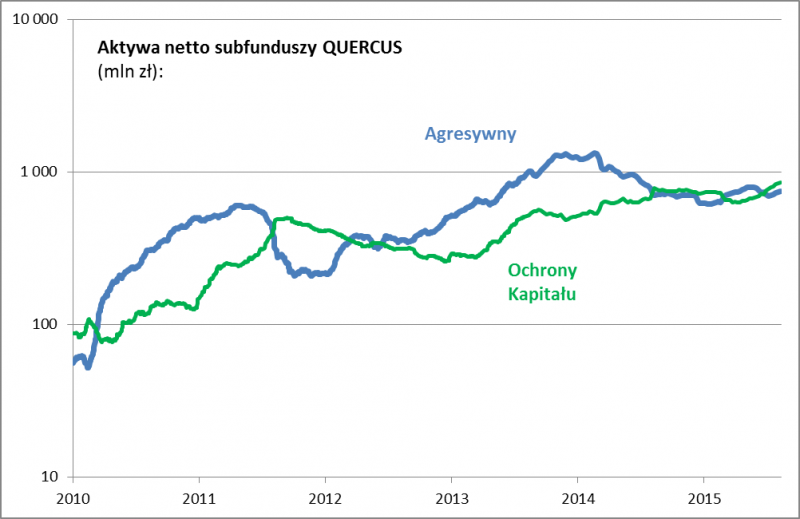 Poziom aktywów poszczególnych klas funduszy inwestycyjnych bywa traktowany jako barometr nastrojów wśród inwestorów. Idąc tym tropem monitorujemy aktywa dwóch funduszy QRS o zupełnie odmiennym nastawieniu inwestycyjnym: QUERCUS Agresywnego (nastawionego na inwestycje w akcje) i Ochrony Kapitału (lokującego w instrumenty dłużne).