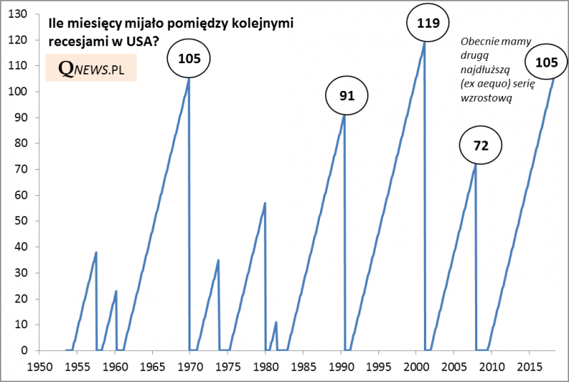 Jednocześnie ciągle dość sporo – 14 miesięcy – brakuje do wyrównania rekordu z lat 90. Wtedy gospodarka USA rosła aż przez 119 miesięcy (prawie 10 lat), zanim doszło do recesji. Gdyby ten rekord miał zostać wyrównany (a trzeba przyznać, że jest przecież mocno wyśrubowany), to gospodarcza „kontrakcja” (ang. contraction) pojawiłaby się w okolicach maja 2019.