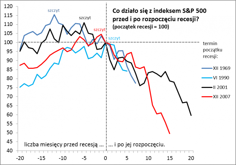 Rys. 3. W ostatnich kilkunastu miesiącach przed nadejściem recesji nowe szczyty hossy „rodziły się w bólach”
