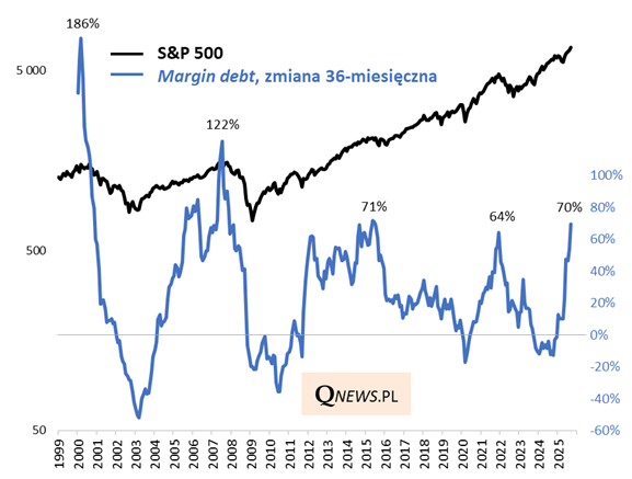 Kilka miesięcy temu pisaliśmy, że margin debt po raz pierwszy przekroczył pułap biliona dolarów. Na koniec września było to już prawie 1,13 bln USD. Nie same kwoty są tu jednak najistotniejsze, lecz raczej tempo zmian długu. Trzecia rocznica rozpoczęcia obecnej hossy na Wall Street (licząc od września 2022) skłania choćby do spojrzenia właśnie na 3-letnią (36-miesięczną) dynamikę zadłużenia. Okazuje się, że na koniec września br. ten przyrost wyniósł już 70 procent.