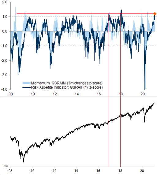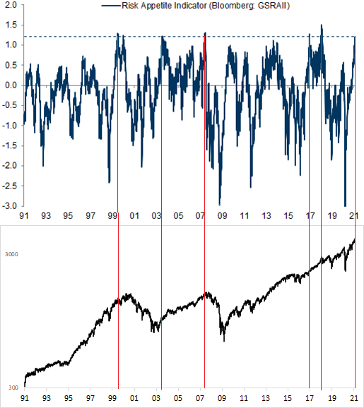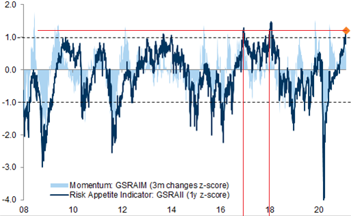 W styczniu pisaliśmy już, że wg globalnego sondażu Bank of America apetyt na ryzykowne aktywa osiągnął rekordowy poziom. Teraz w podobnym tonie wypowiada się Goldman Sachs, którego "wskaźnik apetytu na ryzyko" (GS Risk Appetite Indicator) osiągnął "cykliczne szczyty".