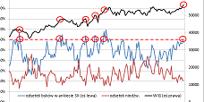 Mimo to historia przynosi pewne wskazówki. Zauważmy, że w przeszłości za każdym razem po przekroczeniu granicy 60% wskaźnik optymizmu potem po jakimś czasie nie tylko cofał się poniżej tego pułapu, ale nawet wędrował poniżej poziomu 50% (ale już niekoniecznie poniżej 40%) - wówczas kupowanie akcji było już bezpieczniejsze.