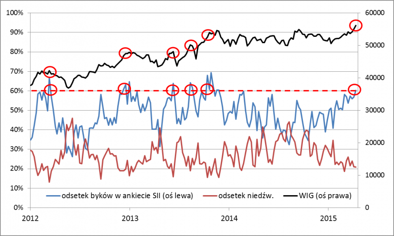 Na krótszą metę jest jednak jedno "ale": silny optymizm rynkowy oraz tzw. wykupienie sygnalizowane przez wskaźniki analizy technicznej. Zwróćmy choćby uwagę, że według najnowszego, czwartkowego odczytu odsetek byków (optymistów) w ankiecie Stowarzyszenia Inwestorów Indywidualnych przekroczył granicę 60% - po raz pierwszy od listopada 2013 r. Historycznie tak powszechny optymizm był niemal niezawodnie zapowiedzią wszystkich głównych korekt spadkowych (niekoniecznie z dnia na dzień).