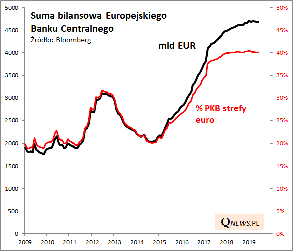 Działania Europejskiego Banku Centralnego od dawna wzbudzają rozmaite kontrowersje. Z pewnością ciężko byłoby chwalić ECB za dobry timing, czy też wyczucie sytuacji w gospodarkach i na rynkach. Najpierw bank przez długi czas wzbraniał się przed wprowadzeniem QE na wzór amerykański, a kiedy w końcu sięgnął po to narzędzie (2015), Fed myślał już o tzw. normalizacji. Co ciekawe ECB nawet prześcignął Rezerwę Federalną pod względem wielkości skupu obligacji. Suma bilansowa banku "spuchła" aż do ok. 40% PKB.
