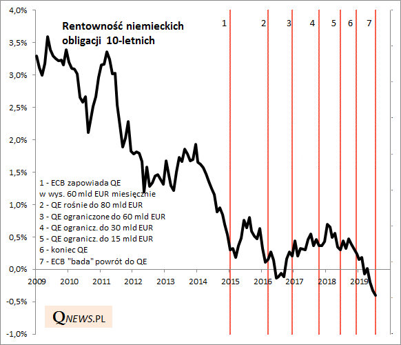 Najbardziej oczywisty był efekt QE, jeśli chodzi o obligacje skarbowe, bo to one przecież były skupywane w ogromnych ilościach przez ECB. Warto jednak zwrócić uwagę, że rynek obligacji działa z pewnym wyprzedzeniem - największy spadek rentowności miał miejsce zanim jeszcze QE ruszyło (bo inwestorzy dyskontowali jego nadejście). Podobnie teraz, rentowność papierów np. niemieckich jest rekordowo ujemna w oczekiwaniu na nową rundę luzowania.