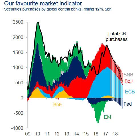 Do projekcji tych nie należy jednak podchodzić bezkrytycznie. Gdyby w dalszej części roku faktycznie miało dojść do bardzo nerwowej sytuacji na rynkach, to prawdopodobnie zarówno Fed, jak i ECB straciłyby szybko motywację do pospiesznej "normalizacji" polityki monetarnej, a tym samym powyższa pesymistyczna projekcja ... musiałaby się zmienić in plus. Zresztą to samo sądzą analitycy Citi: "Plany redukcji bilansu Fedu w połączeniu ze zmniejszeniem zakupów przez ECB, mogą na tyle zdestabilizować rynki, że naszym zdaniem banki nie będą w stanie zrealizować w pełni tych planów."