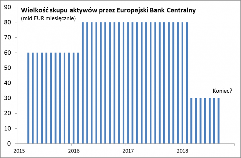 Do podwyżek stóp daleka droga natomiast w strefie euro, ale i tutaj widać dążenie do "normalizacji" polityki monetarnej. Europejski Bank Centralny może dać kolejne sygnały co do momentu zakończenia programu QE, w ramach którego skupuje obligacje skarbowe i korporacyjne. Warto przypomnieć, że QE już dwukrotnie zostało ograniczone - najpierw z 80 do 60 mld EUR miesięcznie, a w tym roku do 30 mld EUR. Teoretycznie obecna "runda" została przewidziana do września br.