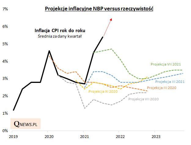 Przypomnijmy, że na październikowym posiedzeniu Rada zaskoczyła rynek podwyżką stopy referencyjnej do 0,5% mimo wcześniejszej ultra gołębiej retoryki. Rodzimemu bankowi centralnemu, podobnie jak bankom na świecie, coraz trudniej jest przekonywać o "przejściowym" charakterze podwyższonej inflacji. Jak pokazuje nasze zestawienie, wcześniejsze projekcje inflacyjne, mimo że za każdym kolejnym razem przesuwane były w górę, i tak drastycznie rozminęły się z rzeczywistością (dziś poznamy kolejną, zaktualizowaną projekcję).