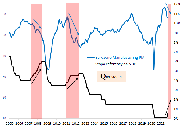 "Pogoń" banków centralnych za szybującymi coraz wyżej wskaźnikami inflacji stwarza jednocześnie ryzyko błędu (policy error) polegającego na pogłębieniu widocznej już teraz zadyszki w gospodarkach. Analizując poniższy wykres nietrudno odnieść wrażenie, że dobrym momentem na rozpoczęcie normalizacji polityki monetarnej było rozpoczęcie gwałtownego wychodzenia wskaźników koniunktury takich jak PMI z pandemicznej zapaści (wtedy banki centralne nie byłyby też tak dramatycznie spóźnione względem inflacji). "Przespanie" tego optymalnego momentu oznacza, że teraz zaostrzanie polityki rozpoczyna się, gdy wskaźniki takie jak PMI już zaczęły spadać ze szczytów, a inflacja jeszcze się rozpędza. Tego typu błędy zdarzały się już w przeszłości.