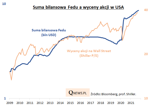 Przykręcenie kurka z pieniędzmi przez Fed może być jednym z najistotniejszych czynników kolejnych miesięcy (wg oczekiwań QE ma zostać wygaszone do połowy 2022 r.), biorąc pod uwagę, że szczególnie po globalnym kryzysie finansowym 2008/09 poziom wycen akcji na Wall Street wydaje się mocno dodatnio skorelowany z poziomem sumy bilansowej Fedu.