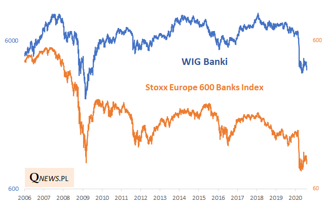 Jedynym pocieszeniem w tej sytuacji jest fakt, że notowania zachodnioeuropejskiego indeksu sektora bankowego wyglądają wcale nie lepiej (a nawet gorzej). W trakcie krachu zawędrował on jeszcze niżej niż w dołku po upadku Lehman Brothers i od tej pory również nie może jak na razie zdecydowanie się podnieść.