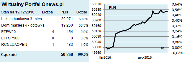 Zgodnie z zapowiedzią już w piątek zredukowaliśmy o połowę naszą wirtualną pozycję w ETFW20 (z 4 do 2 sztuk po cenie 226 zł minus 5 zł prowizji). Z zamknięciem reszty pozycji poczekamy aż barometr nastrojów osiągnie jeszcze wyższe poziomy (oczywiście tak może się nie stać - ale nasza pozycja i tak jest już niewielka).