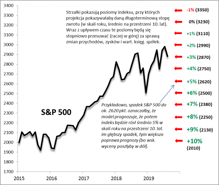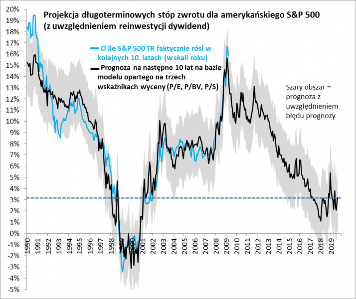 Jednym z możliwych rozwiązań tego dylematu wydaje się sięgnięcie po nasz model prognozujący długoterminowe stopy zwrotu na podstawie trzech wskaźników wyceny (P/E, P/S, P/BV). Przypomnijmy tylko, że model na podstawie bieżących wartości tych wskaźników „wypluwa” – w oparciu o historyczne relacje – szacunek przyszłego zarobku inwestorów na przestrzeni kolejnych dziesięciu lat.