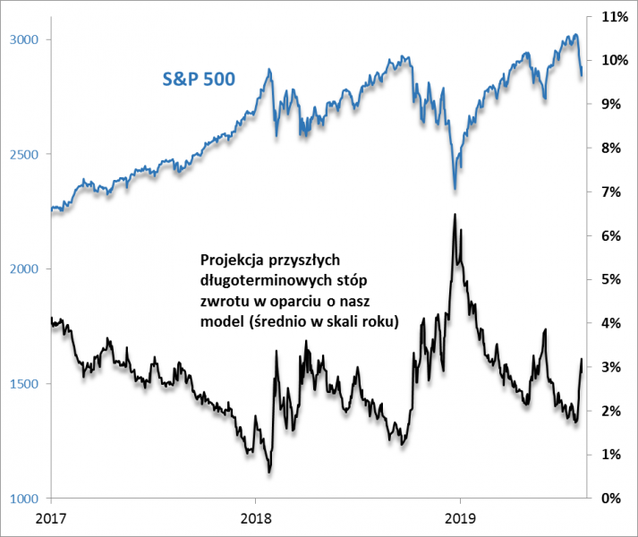 Przy okazji niedawnego pobicia przez S&P 500 rekordu wszech czasów pisaliśmy, że stało się to kosztem ponownego zejścia naszego szacunku do wyjątkowo nieatrakcyjnego pułapu. Ostatnia korekta wywołana przez kolejny etap rozgrywki Trump-Chiny-Fed nieco poprawiła projekcję. W pewnym momencie prognoza podskoczyła do ponad 3 proc. w skali roku (przypomnijmy – średnio na przestrzeni dziesięciu lat). Pokazuje to, z jakimi uwarunkowaniami mają do czynienia obecnie inwestorzy na Wall Street. Wyceny akcji doszły do poziomów, przy których coraz trudniej o ruch w górę, a coraz łatwiej o przecenę. Szczególnie przy skomplikowanej sytuacji makro i ryzykownych działaniach polityków.