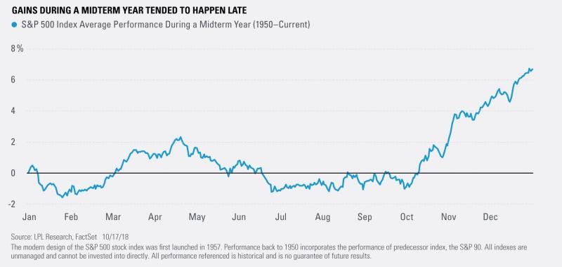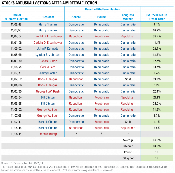 Abstrahując już od implikacji związanych z wielką polityką, amerykańscy analitycy pokusili się o sprawdzenie jak rynek akcji zachowywał się historycznie po "midterms". Okazuje się, że ... nieźle, przynajmniej w horyzoncie rocznym. We WSZYSTKICH 18. przypadkach w powojennej historii USA indeks S&P 500 był wyżej po roku od wyborów uzupełniających. I to bez względu na to która partia zyskała kontrolę nad poszczególnymi izbami Kongresu i czy zwycięzcy znaleźli się w opozycji do urzędującego prezydenta.