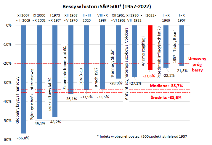 Konkluzja wydaje się prosta – skoro przekroczenie progu bessy przez S&P 500 jest „OK”, to należy chyba domniemywać, że przecena musi stać się dużo głębsza, by przestała być „OK” i by Fed złagodził swój kurs. Wspomniane wcześniej konserwatywne założenie mówiące, że wyznacznikiem dla zasięgu bessy jest historyczna średnia, a nie najbardziej łagodne przypadki, wydaje się w tym kontekście tym bardziej uzasadnione.