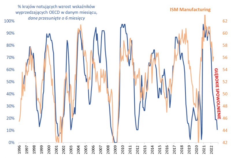 Po ponad pół roku od naszej wstępnej diagnozy na temat nadciągającego spowolnienia modele wyprzedzające przesunęły się sporo do przodu, sygnalizując na drugą połowę tego roku wejście spowolnienia w mocno zaawansowaną fazę, ocierającą się już o recesję. Przykładem są opublikowane w mijającym tygodniu wskaźniki wyprzedzające OECD. Już tylko niecałe 11 proc. krajów objętych badaniem tej organizacji notuje wzrost wskaźników wyprzedzających rok do roku. To z kolei wróżyć może – jeśli wierzyć historycznej korelacji – dalszy mocny zjazd np. amerykańskiego ISM Manufacturing, wskaźnika kondycji przemysłu.
