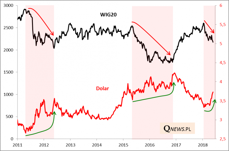 Ostatnie wydarzenia potwierdzają natomiast, że za "bezpieczną przystań" w portfelu uznać można ... waluty takie jak dolar, jen japoński czy też frank szwajcarski. Zauważmy jak wyraźna jest ujemna korelacja między notowaniami USD, a rodzimym WIG20.