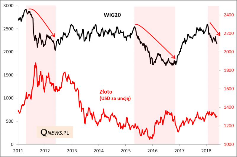 Według obiegowej opinii tzw. bezpieczną przystanią w okresach turbulencji na rynkach akcji jest złoto. Nasza analiza nie potwierdza jednak trafności tej tezy. Złoto nie sprawdza się w tym roku jako przeciwwaga dla taniejących polskich akcji. Nie sprawdziło się też np. w 2015 roku. Nie ma prostej reguły opisującej wzajemne interakcje między tymi dwiema klasami aktywów.