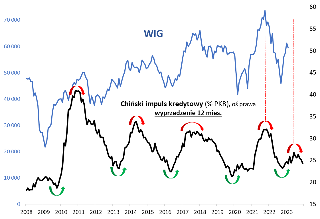 Na razie jeszcze pierwsza połowa roku wygląda w miarę korzystnie przez pryzmat chińskiego impulsu kredytowego. Biorąc pod uwagę, że jest to jedyny wskaźnik makroekonomiczny, który z wyprzedzeniem pozwolił zaprognozować silne ożywienie na rynkach akcji trwające od jesieni, można zakładać (patrz – wykres), że to pozytywne oddziaływanie utrzyma się właśnie w pierwszej połowie tego roku.