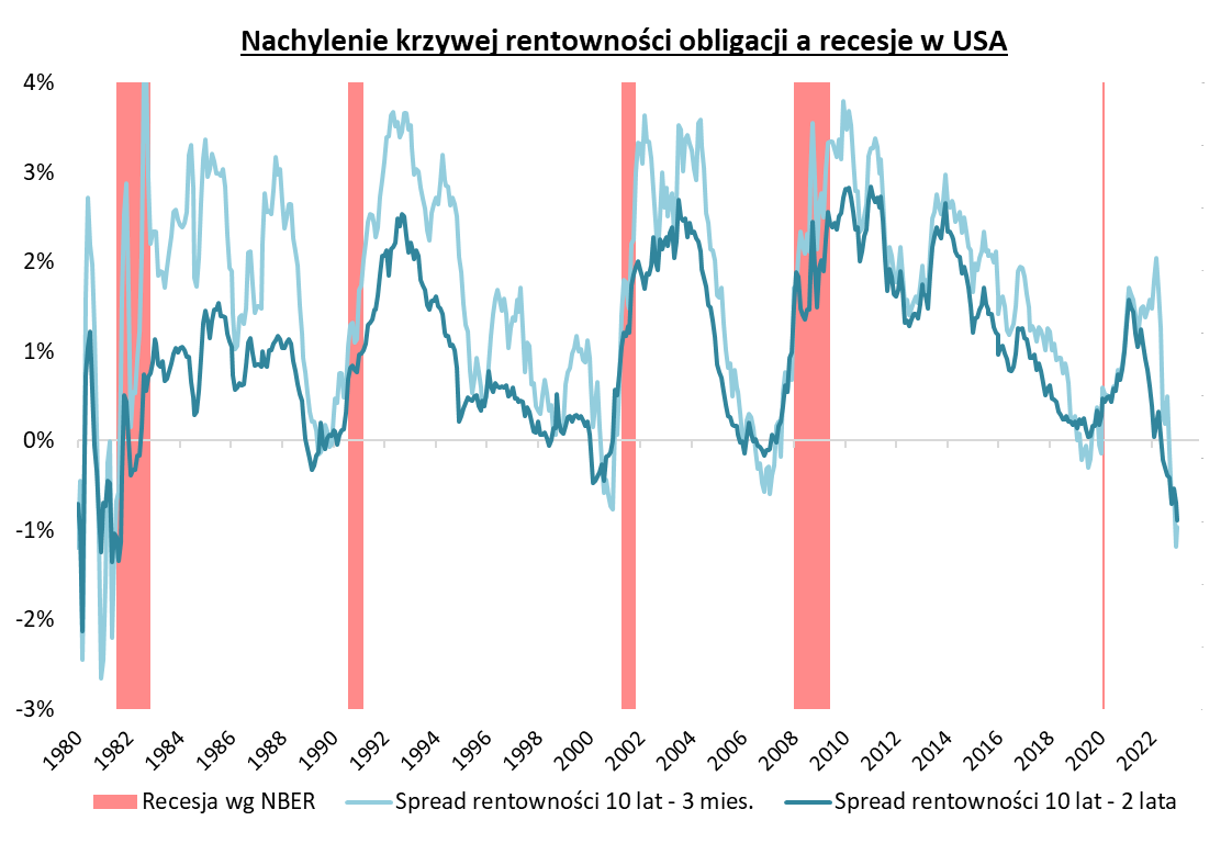 Rys. 3. Najgłębsza od czterech dekad inwersja krzywej rentowności amerykańskich obligacji przypomina o recesji na horyzoncie