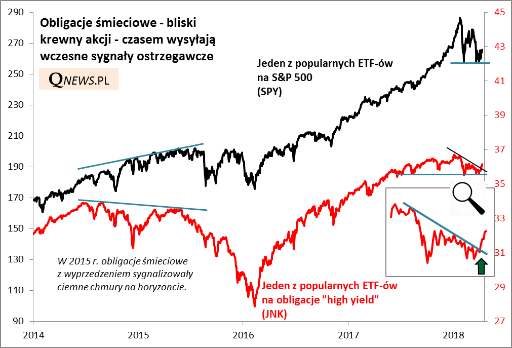 Często usłyszeć można stwierdzenie, że "rynek obligacji jest mądrzejszy (sprytniejszy) niż rynek akcji". I faktycznie, w przypadku USA w przeszłości zauważyliśmy już, że obligacje - szczególnie te najbardziej ryzykowne, określane mianem "śmieciowych", przynoszące wysoką rentowność za cenę wysokiego ryzyka - potrafiły niekiedy wysyłać wczesne sygnały ostrzegawcze. Najlepszym tego przykładem były lata 2014-2015. Wyraźna negatywna "dywergencja" (rozbieżność) między zachowaniem "śmieciówek" i S&P 500 jak się potem miało okazać zapowiadała ciemne chmury na horyzoncie. Jeśli jeszcze bardziej cofnąć się w przeszłość, to warto również wspomnieć, że rynek ryzykownych obligacji zaczął załamywać się już w lecie 2007 roku, zanim przez rynki akcji przeszła pierwsza fala bessy.