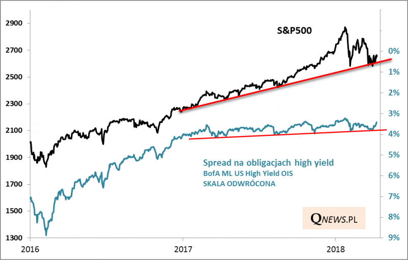 Z kolei w listopadzie ub.r. zaczęliśmy zwracać uwagę, że obligacje wysokiego ryzyka (high yield) nie podzielają giełdowego entuzjazmu. Rozbieżność powiększała się aż do stycznia, po czym ... w lutym i marcu rynek akcji przeżył solidne tąpnięcie.